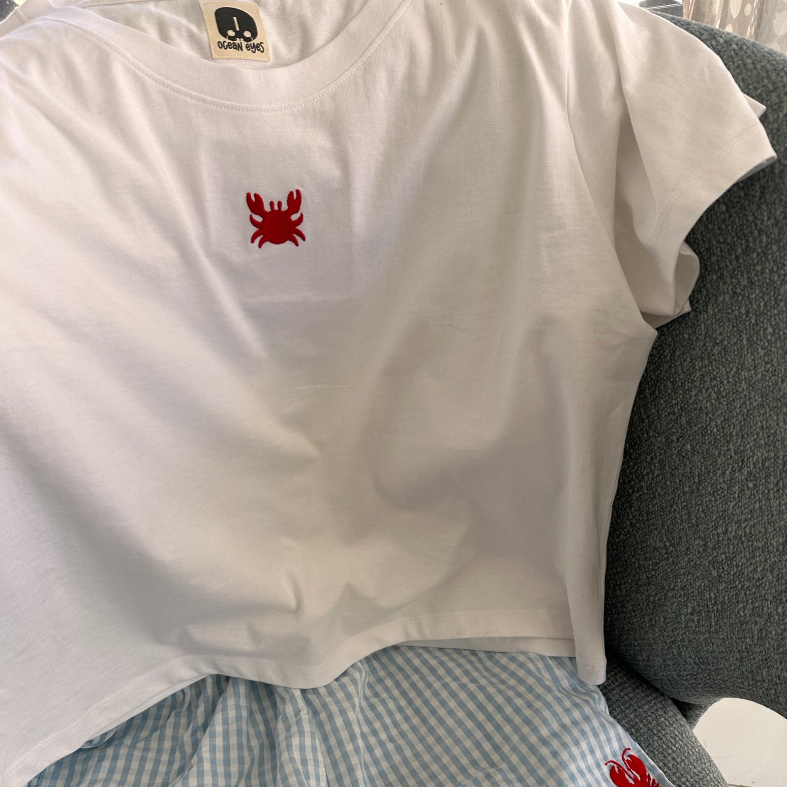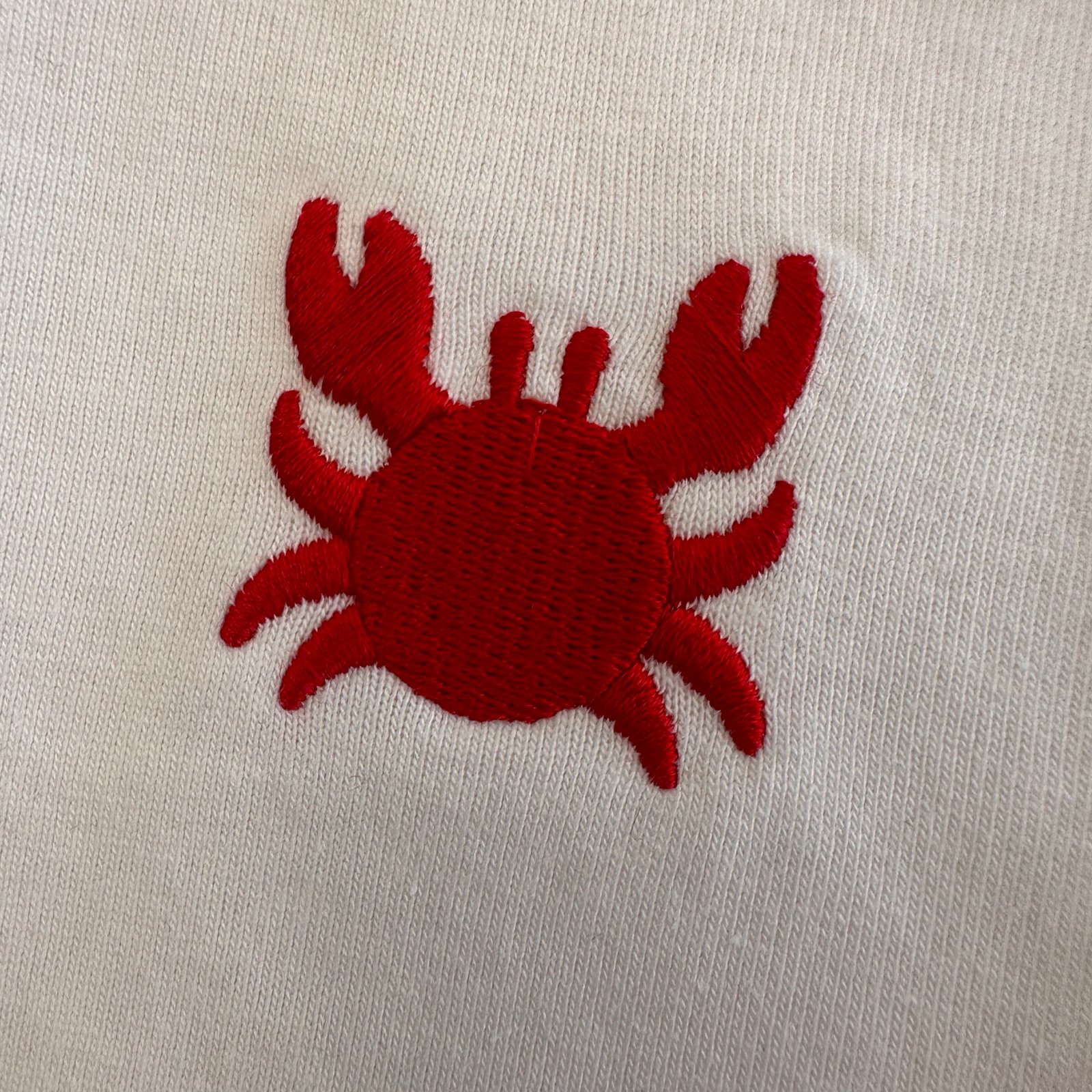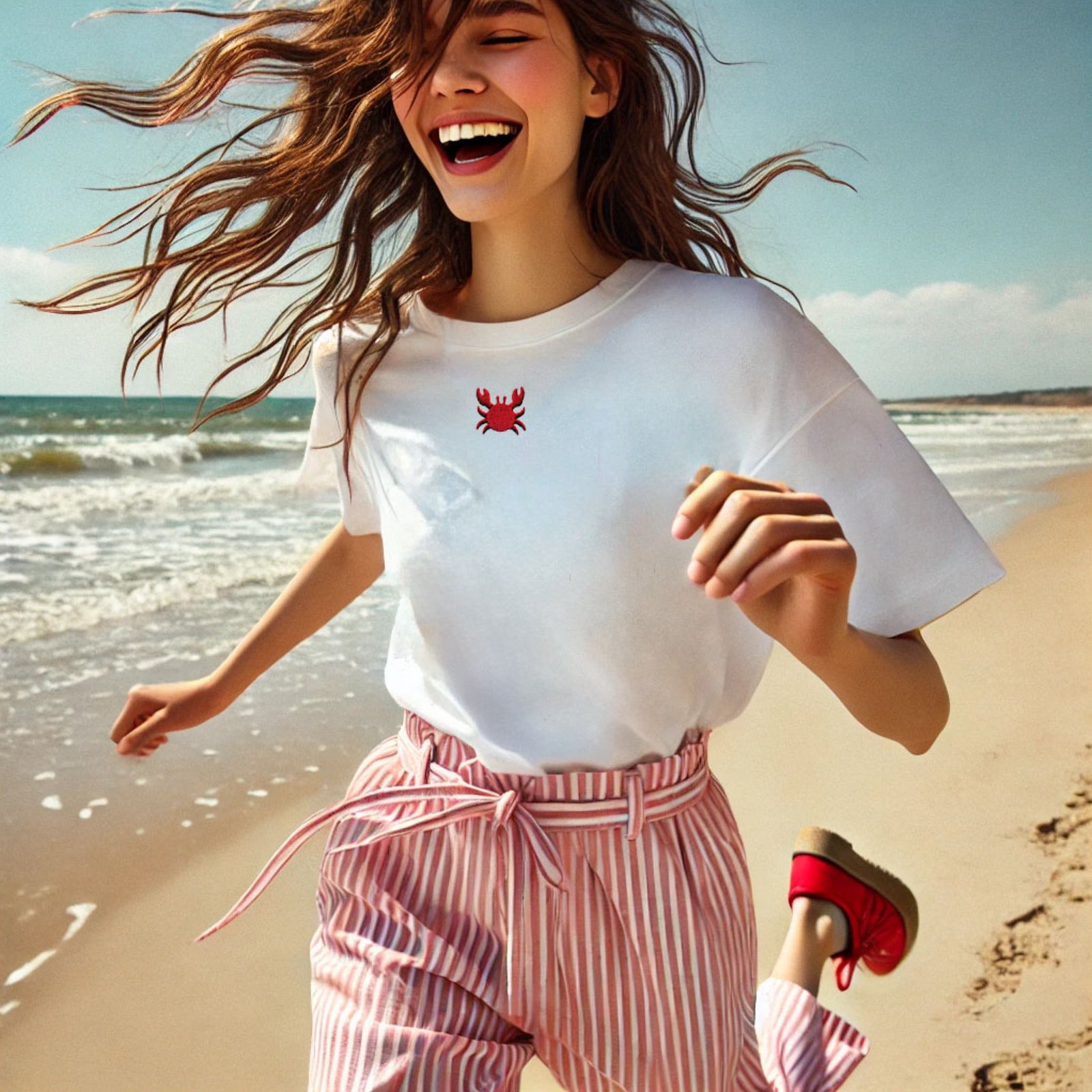 Stay cool in this relaxed white beach t-shirt – the Crab Walk Tee. Featuring a cute red crab print and breathable cotton boxy fit, it’s the perfect casual wear for sunny beach days.